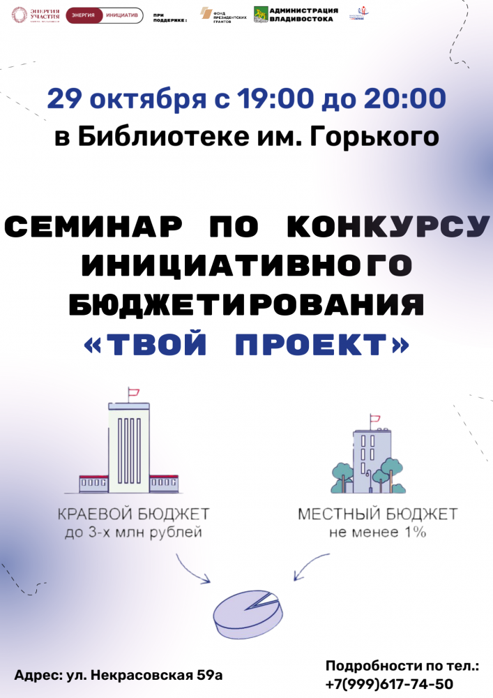 Проводим семинар по конкурсу инициативного бюджетирования «Твой проект» (pib.primorsky.ru/Menu/5?Ite...). На встрече вы узнаете: