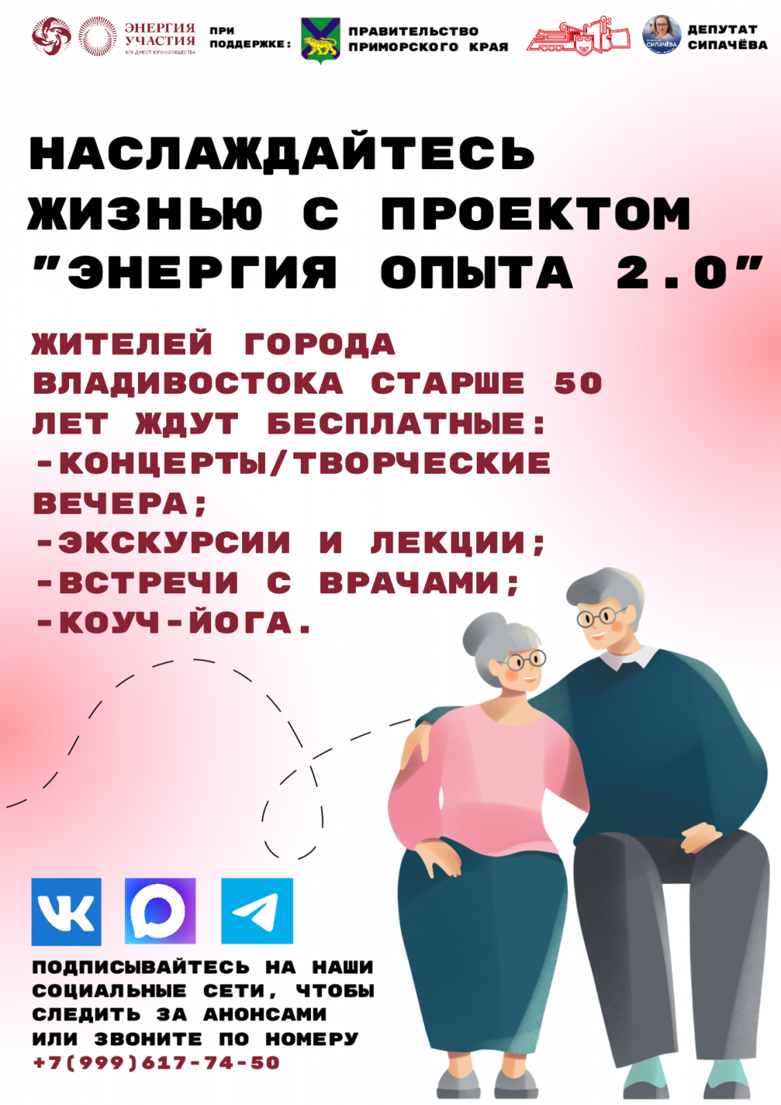 С февраля на целый год во Владивостоке запускается масштабное продолжение популярной инициативы для людей 50+ «Энергия опыта 2.0». Проект направлен на борьбу с социальной изоляцией, укрепление здоровья, культурное обогащение и создание дружного сообщества активных горожан.