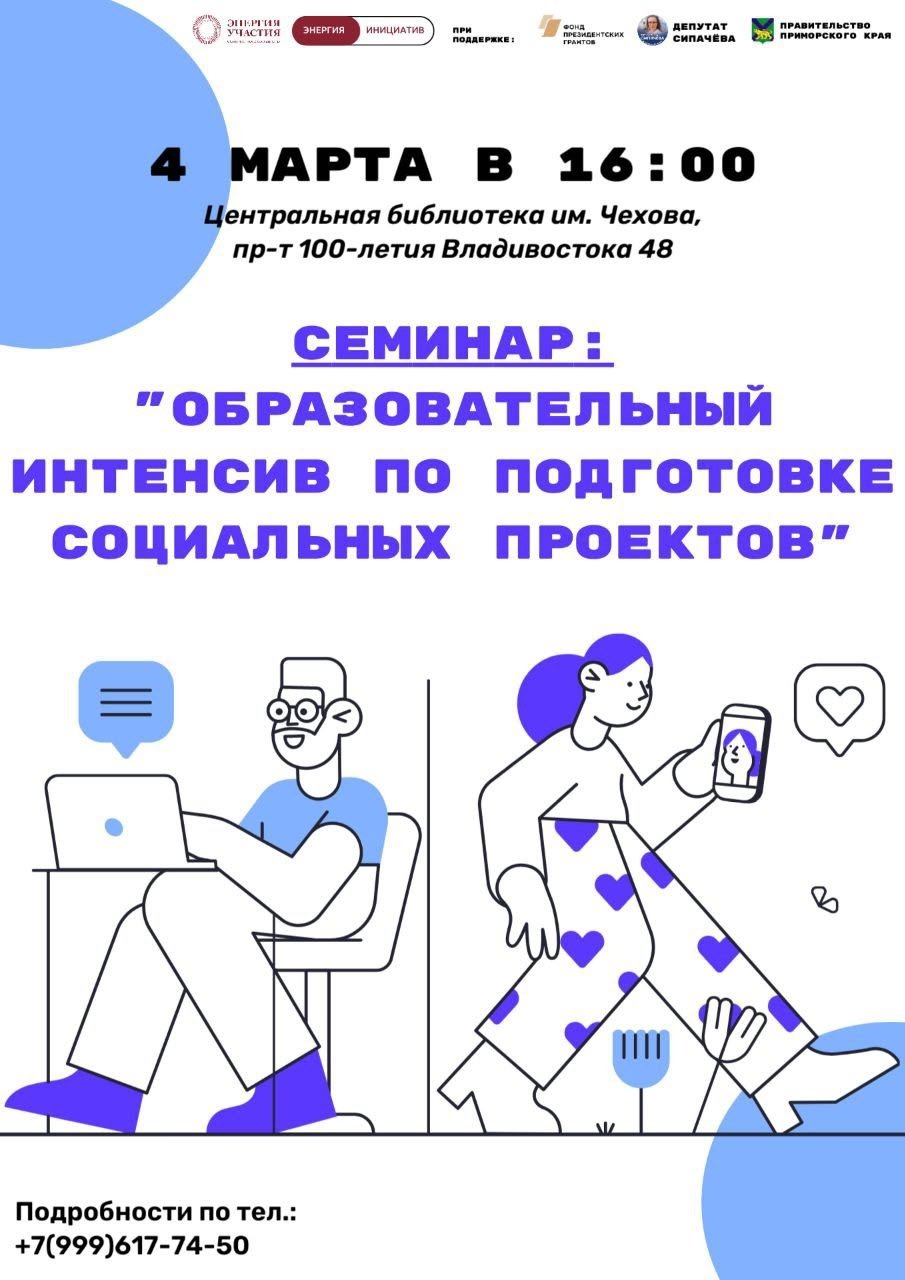 Спикер - Вероника Сипачёва, депутат Думы г. Владивостока, президент фонда «Энергия участия», эксперт по грантовым конкурсам. Семинар проводится совместно «Школой НКО» и проектом «Энергия инициатив 2.0» при поддержке Фонда президентских грантов.